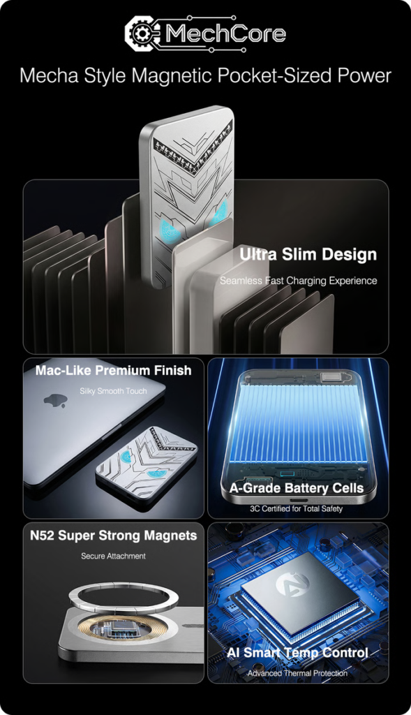 6mm slim, 98g lightweight mecha-design power bank with 15W wireless, 22.5W wired charging and safe smart temperature control.