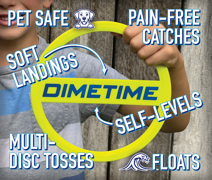 The DimeTime Disc is the ultimate throwing disc that redefines fun and connection. This exceptional disc is engineered with a unique crossbar system, guaranteeing self-leveling and accurate, dime-like passes with every throw. Made from a soft, silicone-like material, the DimeTime Disc is gentle on the hands, making catching effortless and enjoyable for players of all skill levels. Its remarkable design allows it to float on water, adding an extra layer of entertainment for beach and pool outings. Experience the joy of a helicopter-like landing, enhancing the overall play experience. Beyond its superior flight capabilities, the DimeTime Disc promotes real-life interaction, encouraging face-to-face connection and strengthening relationships. Born from a creative collaboration between a father and son in the Pacific Northwest, the DimeTime Disc embodies the spirit of fun, innovation, and shared experiences. Ditch the screens and embrace the DimeTime Experience, fostering connections and creating lasting memories through engaging outdoor play.